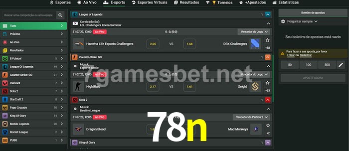 O 78n oferece uma grande seleção de opções de apostas em e-sports com probabilidades competitivas